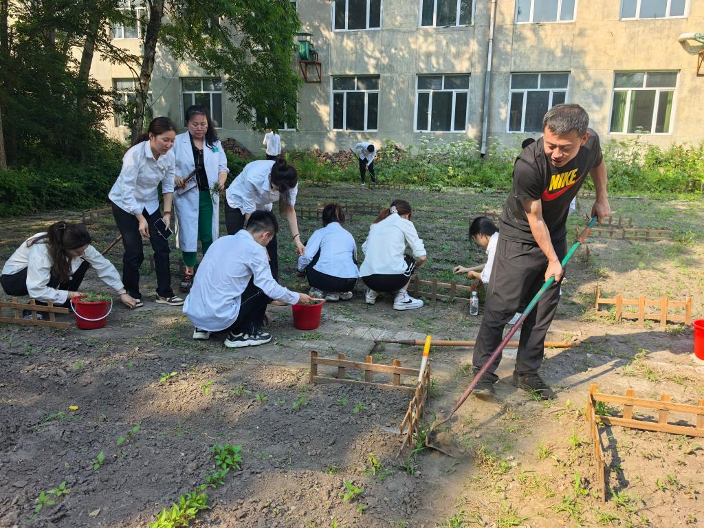 师生们共同除草、松土、浇水和植株维护等工作,专业教师董术发结合实践环节,现场讲解药用植物的栽培技术、生长特性及药用价值,将课堂知识与劳动实践紧密结合。