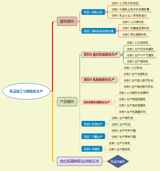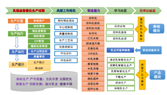 本课程整体设计遵循“成果导向+行动学习”理念,“基于乳品生产岗位工作过程的典型任务”,突出职业技能与岗位需求对接,课程内容分为基础模块和产品模块两部分,基础模块乳品生产岗位的通用流程任务:岗前必知、原料乳验收、贮存和运输。这个模块将从奶源开始进入乳品生产工作场景。产品模块以乳品市场典型产品为载体,突出龙江乳业产品布局特点,以低温奶和配方乳粉为主,基于典型工作任务,以智能化生产的工作过程为主线,学习不同乳制品的加工工艺、质量控制及智能化生产流程,构建“知标准-明工艺- 会操作-懂质控”的岗位核心能力,树立数字化时代乳品加工、乳品质量控制的新工科思维。