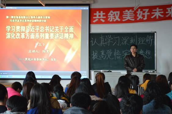 此外,我院还于3月28日15时组织全体学生观看了由黑龙江省委书记、省长等领导做出的“关于学习贯彻习近平总书记关于全面深化改革的系列重要讲话”工作报告的视频录像。领导们就黑龙江的政治、经济、文化、社会、生态文明等方面,深刻剖析解读了习近平总书记的重要讲话,使学生们对党的十八届三中全会的精神更加深入了解。
