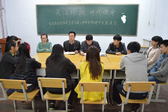 2014年3月27日18时,学管办组织各班学生代表开展了以“关注时事,了解时事”为主题、学习贯彻党的十八届三中全会精神的座谈会。车延平副院长以及左远鹏副主任参与了此次活动,并对党的十八届三中全会上习近平总书记的重要讲话进行了全面的分析解读。车院长向学生们介绍了党的十八届三中全会传达的主要精神,同时还向学生们深入解读了“中国梦”这一概念, “中国梦”是中国共产党召开第十八次全国代表大会以来,习近平总书记所提出的重要指导思想和重要执政理念,全面概括了中国的发展方向。座谈会期间学生代表纷纷发言、阐述各自独到的见解,充分体现了学生们对学习贯彻党的十八届三中全会精神的认知与理解。车院长在总结中指出,我院将举办更多此类活动,从而更全面地了解大学生心理,大力提高大学生的素质教育。