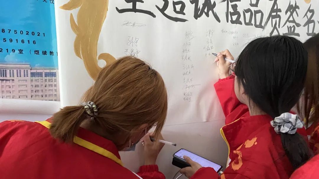 一笔一画,郑重认真,这不仅是一个简单的签名,更是一种承诺,也感觉到诚信的重要性,之后将签好字的画板展示在大厅,以便更多的同学受此感悟。