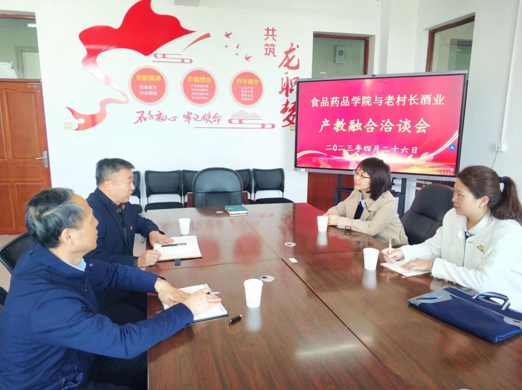 4月26日,在2号实训楼525室召开了食品药品学院与黑龙江省老村长酒业有限公司产教融合洽谈会,出席本次会议的有黑龙江省老村长酒业有限公司人力资源总监刘琼瑶、招聘经理郭玉玲、食品药品学院党总支书记陈晓华、院长赵岩、党总支副书记高财智。