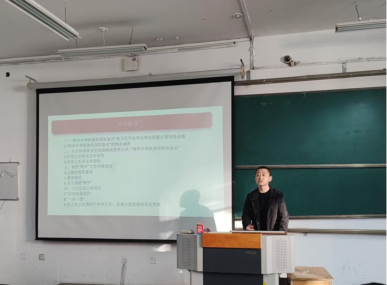 为深入学习党的二十届三中全会精神,学习贯彻落实习近平总书记关于铸牢中华民族共同体意识的重要论述,按照学校的安排,12月6日,宣传统战部副部长金融鑫为马克思主义学院带来一场题为《铸牢中华民族共同体意识》的专题宣讲。