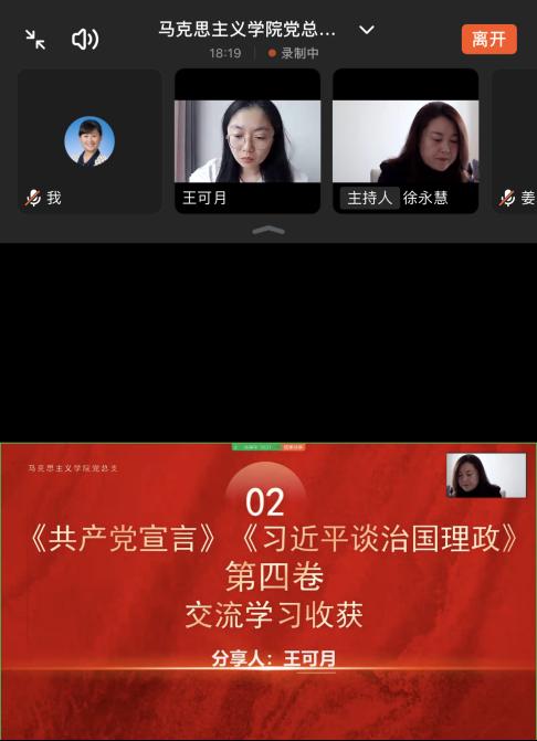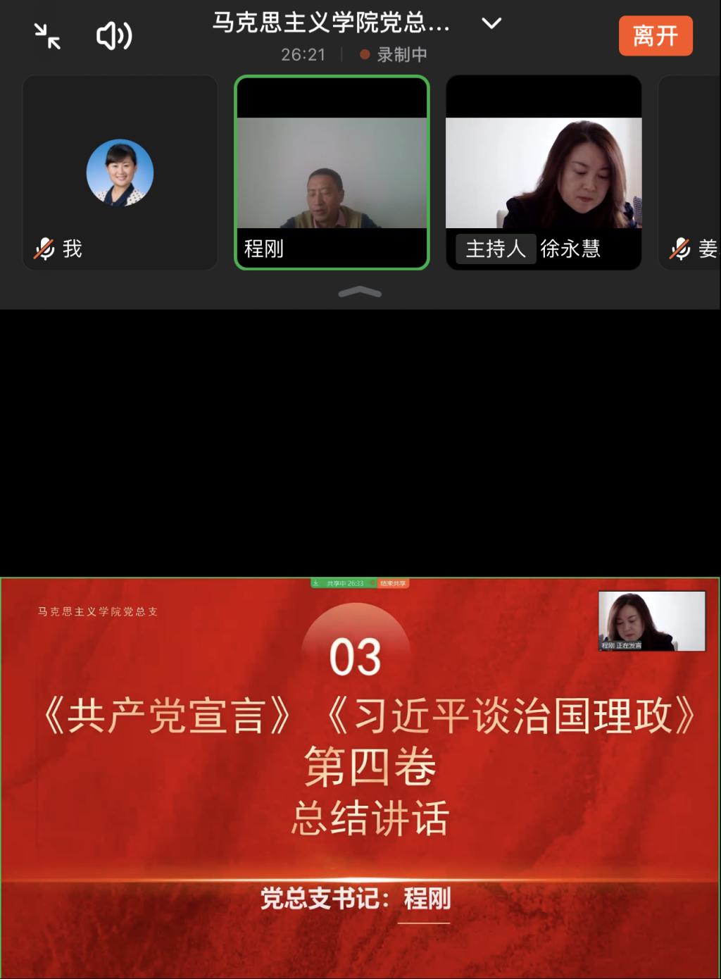 为了进一步培养党员干部对主题教育学习活动的思想自觉和行动自觉,加深对习近平新时代中国特色社会主义思想重大意义、科学体系、丰富内涵的理解,学深悟透、融会贯通、真信笃行,增强贯彻落实的自觉性、坚定性,提高运用党的创新理论指导实践、推动工作的能力,使党员干部在学思悟上有新进步,在思想认识上有新提升,在践行宗旨使命中有新成效,马克思主义学院教师第一支部组织全体党员读原著、学原文、悟原理于2022年10月14日下午1点30分齐聚云端召开了理论学习会议。