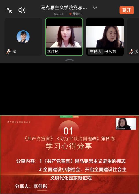 其次,李佳彤同志分享《共产党宣言》是马克思主义诞生的标志和《习近平谈治国理政》第四卷谈全面建成小康社会,开启全面建设社会主义现代化国家新征程的学习心得。李佳彤老师结合自己的读书体会和工作感悟,诠释教师要坚守育人初心和立德树人根本任务,引导青年学生胸怀国际国内“两个大局”,积极教育引导青年正确认识世界、全面了解国情、把握时代大势;教育引导青年走出自身成长的“迷局”,走向全面建设社会主义现代化国家新征程的“强局”,迎接世界百年未有之变局的挑战。