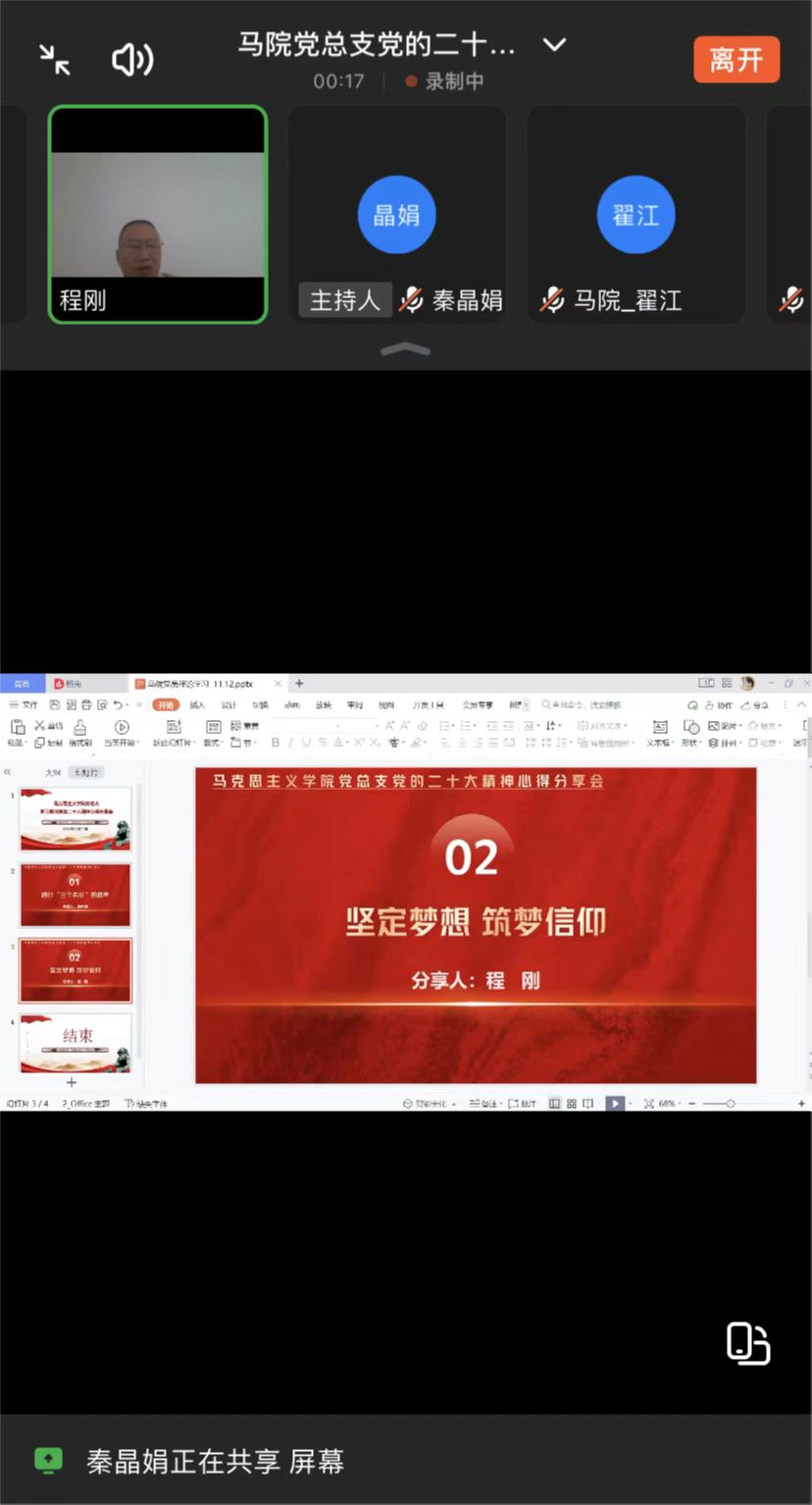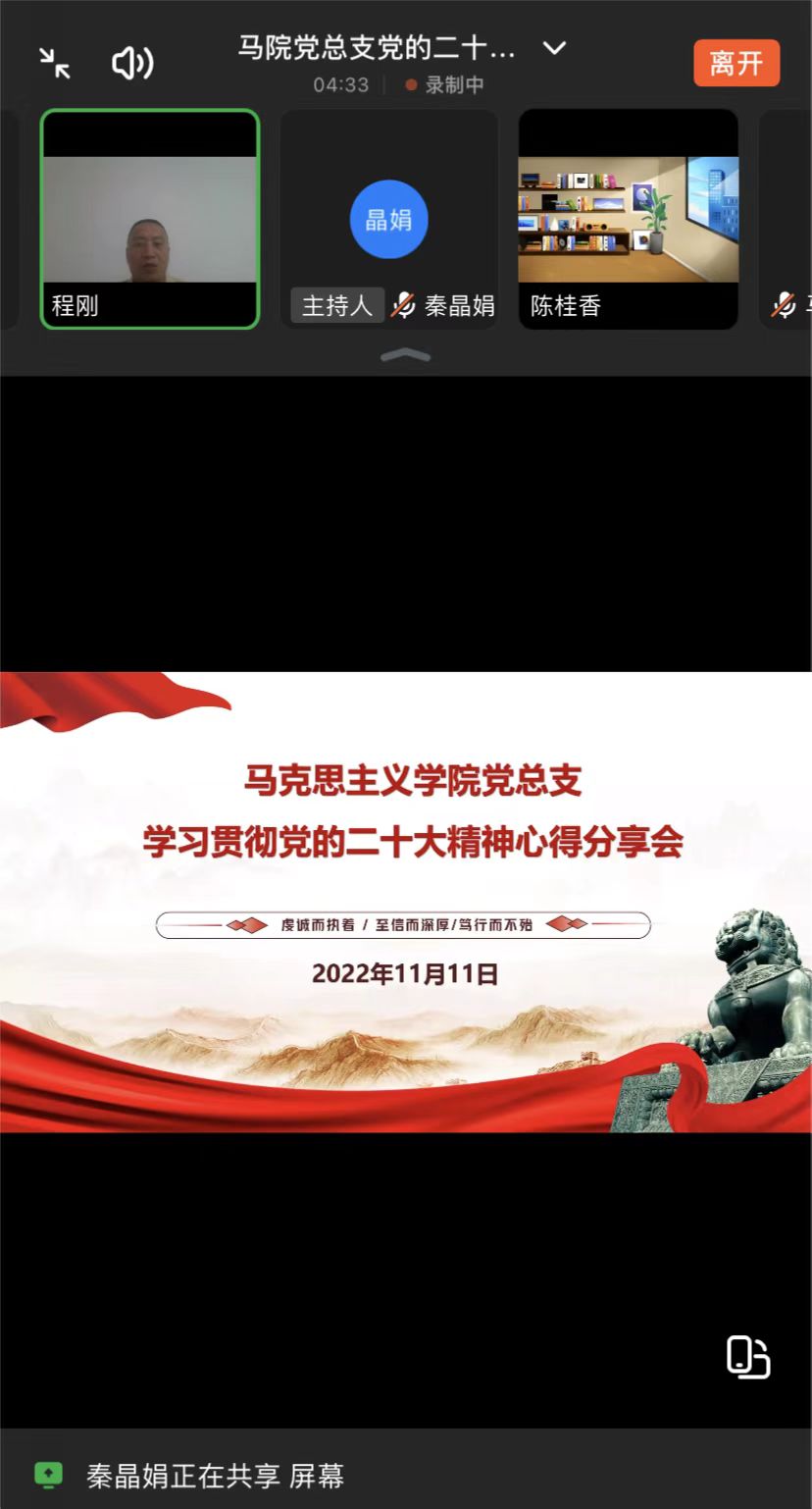 中国共产党第二十次全国代表大会是一次高举旗帜、凝聚力量、团结奋进的大会。学习宣传贯彻党的二十大精神是当前和今后一个时期全党全国的首要政治任务,马克思主义学院党总支认真贯彻落实学校关于学习贯彻党的二十大精神相关工作要求,于2022年11月11日下午1点30分在钉钉线上召开学习贯彻党的二十大精神心得分享会。会议由党总支书记程刚主持,马院全体教师参会。