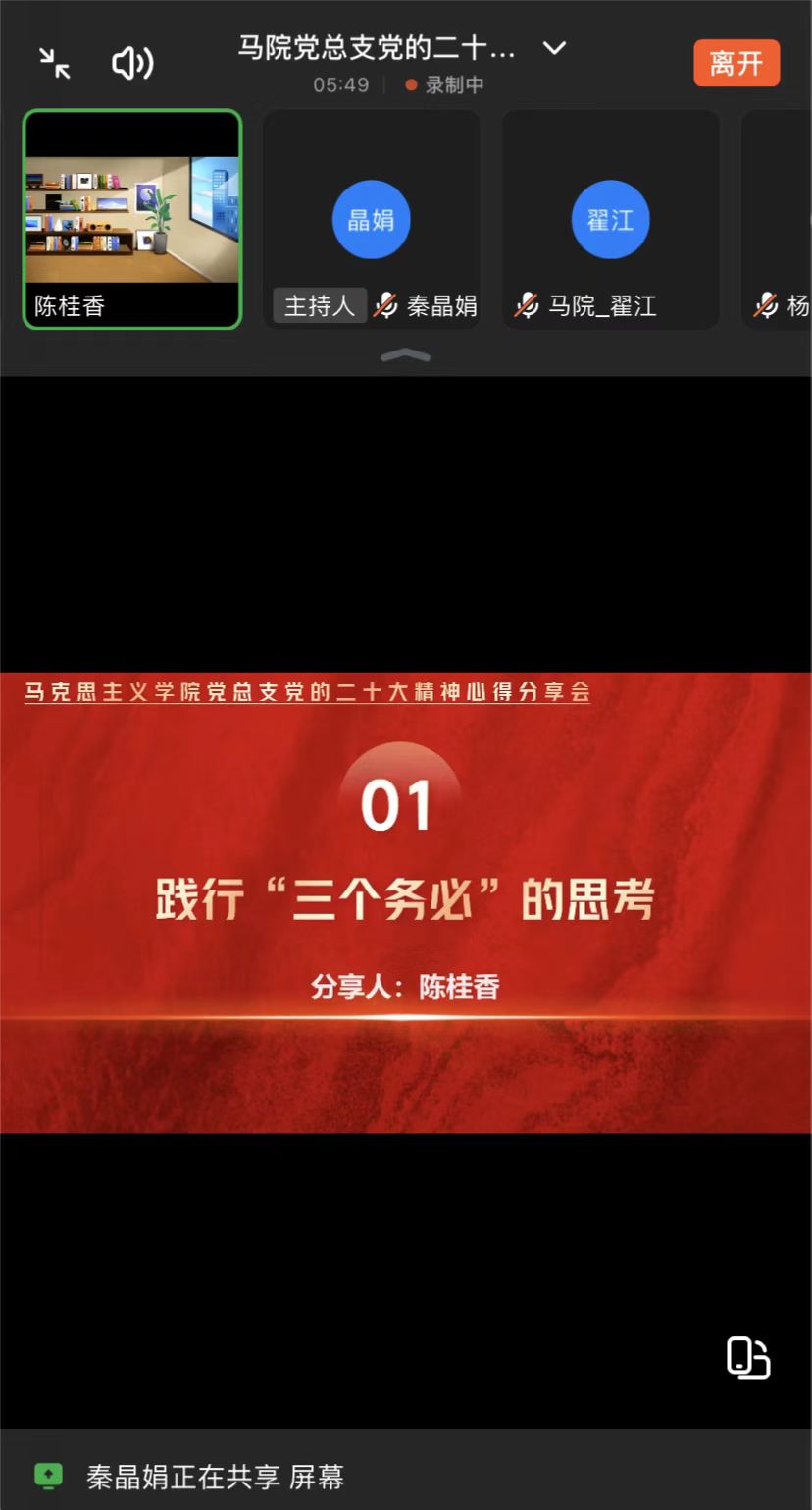 会议第二项陈桂香以‘践行“三个务必”的思考’为题进行分享。陈桂香首先梳理了从“两个务必”到“三个务必”是党跨越70多年时空的对话,变的是数字,不变的是中国共产党优良的作风以及一脉相承的自觉和清醒。随后谈到“三个务必”提出的深刻内涵及提出的意义以及践行的要求。最后分享了马院教师学深悟透党的二十大精神的建议,倡议要对照着学、生动地学、系统地学,并推动党的二十大精神进教材、进课堂、进头脑。