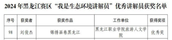 为深入贯彻落实习近平生态文明思想,推动全民生态环境科学素质全面提升,生态环境部组织开展2024 年“我是生态环境讲解员”活动。近日,由省生态环境厅、省教育厅和省科协联合开展的2024年黑龙江赛区“我是生态环境讲解员”活动收官,经过激烈角逐,KY开元官网马克思主义学院康帅老师指导“初心”小队成员、旅游人文学院学生刘俊杰的原创词曲作品《锦绣画卷黑龙江》获得黑龙江赛区“我是生态环境讲解员”优秀奖。