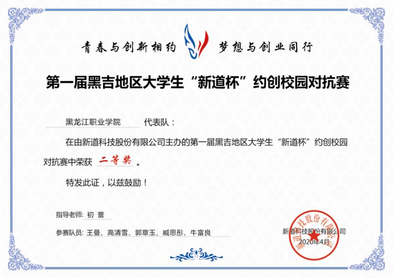 在约创校园对抗赛中丛洪娟老师指导的龙职一队,参赛学生:姚奕同、孙鑫阳、郭禹生、樊加田、宋铭铠获得一等奖;初蕾老师指导的龙职二队,参赛学生:王曼、高清雪、郭章玉、臧思彤、牛富良获得二等奖。在数字营销对抗赛中丛洪娟老师指导的姚亦同、王曼、高清雪和宋铭铠获得二等奖。
