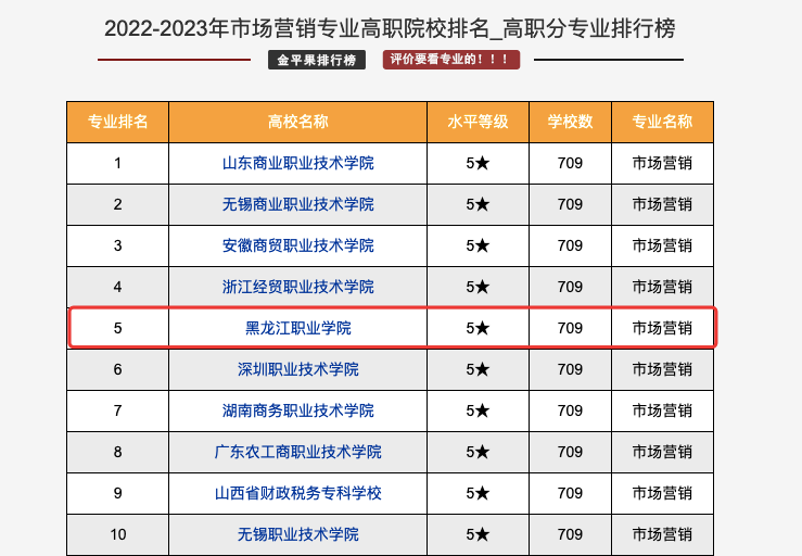 在2022年3月,金平果连续第十一次推出中国高职院校竞争力排行榜,本次高职评价范围以教育部最新公布的《2021年全国高等学校名单》为依据,结合学校的实际招生情况,确定高职院校评价对象为1516所,其中高职高专1484所、职业本科32所。从学校、地区、类型、专业大类、专业类、专业和专业群等多维度科学量化结果。KY开元集团官网入口市场营销专业在2022-2023年高职院校专业排名中位居全国第五位。
