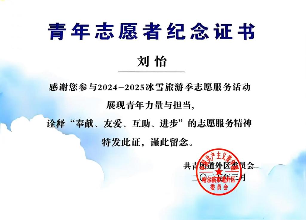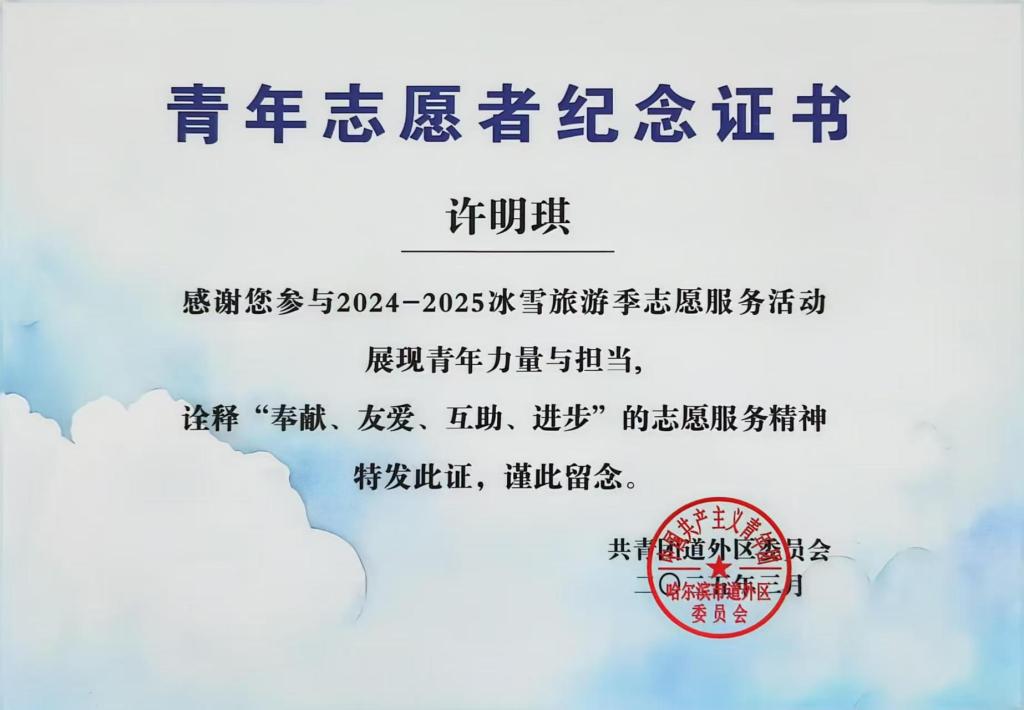 汇报结束后,道外区团委为本次志愿服务当中表现优异的志愿者进行表彰,我院学生工企管理23-01班许明琪、连锁管理23-02班刘怡荣获“青年志愿者纪念证书”。