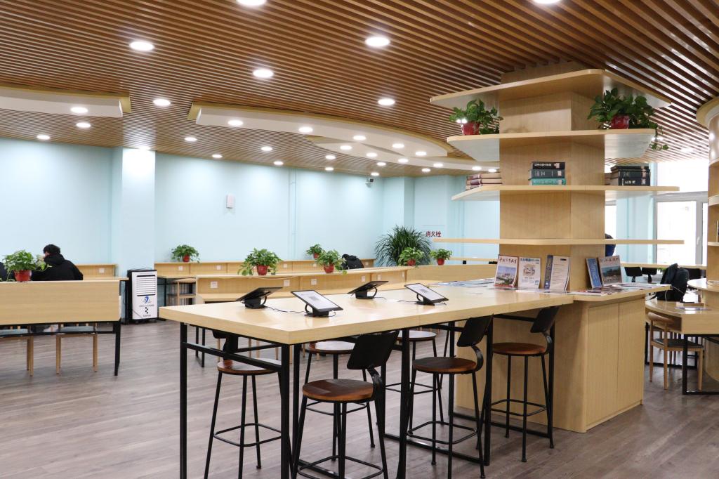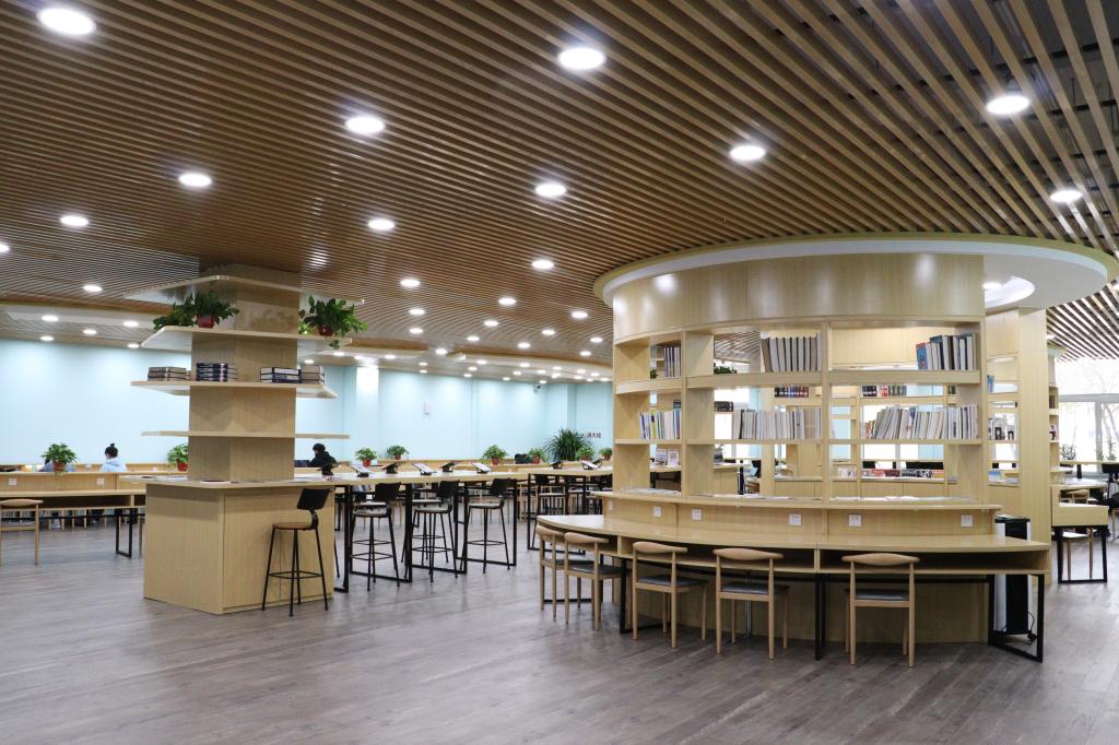 工匠楼多功能阅览厅,棚顶灯光采用5700K接近自然光护眼色温,桌面配备智能人体感应阅读照明灯,书桌搭配五孔和USB插座满足各种设备需求,为读者营造温馨、舒适、整洁的阅读环境。
