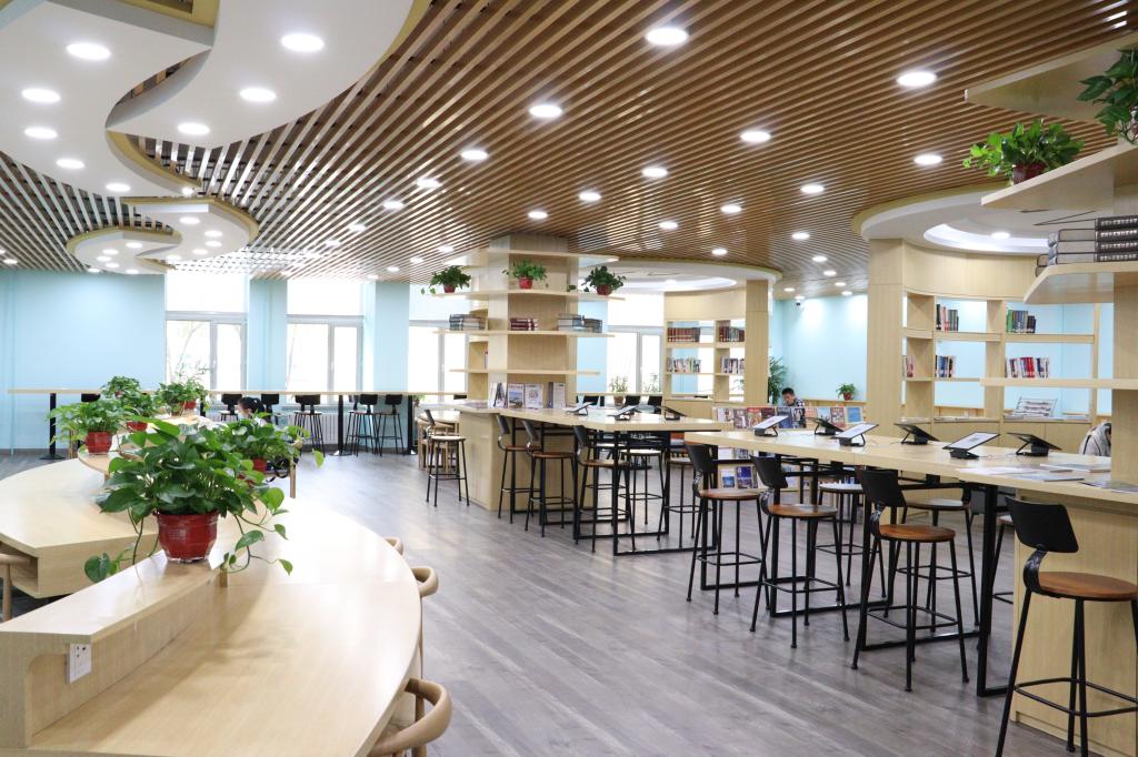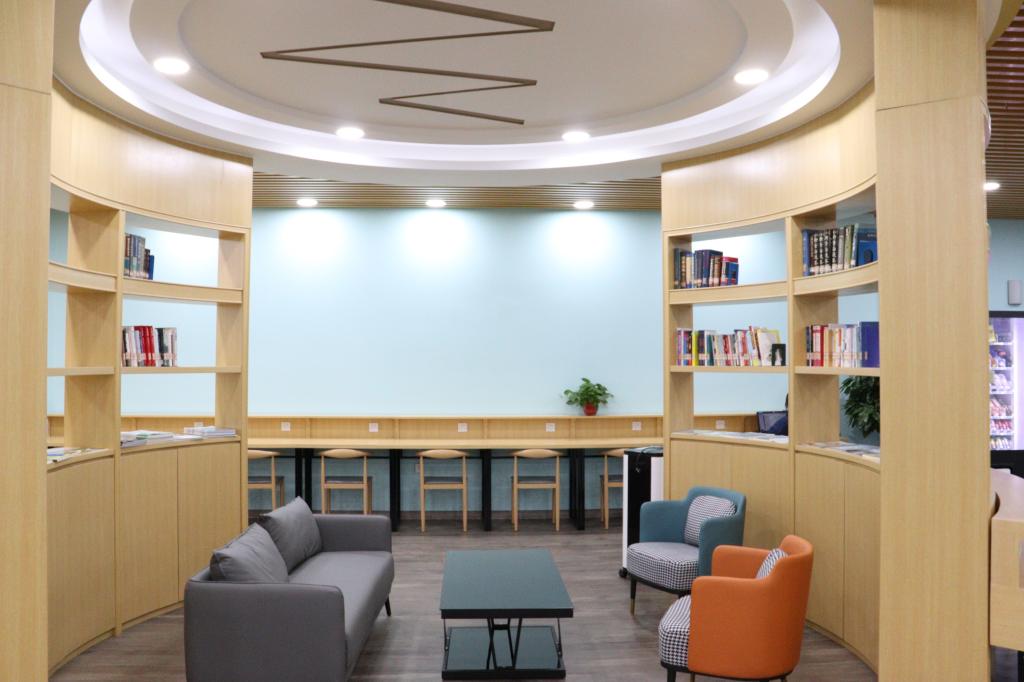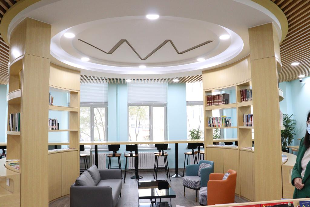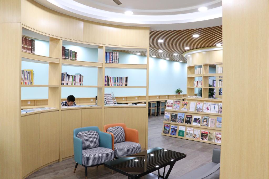 两个半圆形书墙组成的集阅览、休闲、体验,创客空间等功能于一体的智慧书房,配有10台电子书阅读器的吧台,为读者提供书报刊阅览、交流等服务。