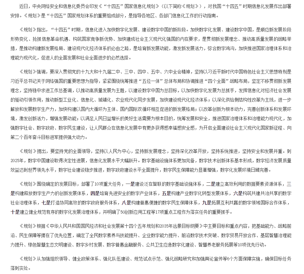 中央网络安全和信息化委员会印发《“十四五”国家信息化规划》