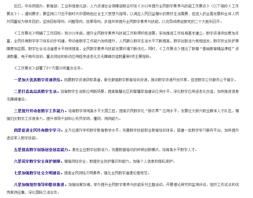 中央网信办等四部门印发《2022年提升全民数字素养与技能工作要点》