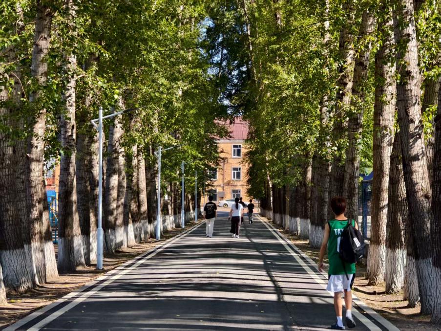 走在微风拂过的校园大道上
