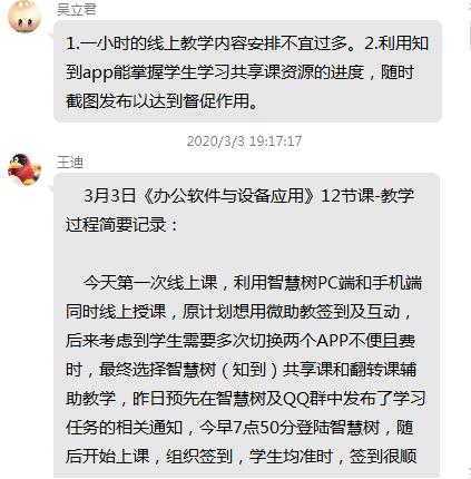 从学期初,学校发布在线教学工作通知开始,信息技术基础教研室组织教师进行了两次网上集体备课、一次集体听评课和三次网络授课经验交流活动。通过这些活动,针对学生在家,实训设备不足的特殊性,老师们从课程内容的调整、课程资源组织、课程资源的发布形式、课堂教学设计、线上学习的方式、线上学习存在的问题与对策等多个方面进行了深入的研讨与交流。