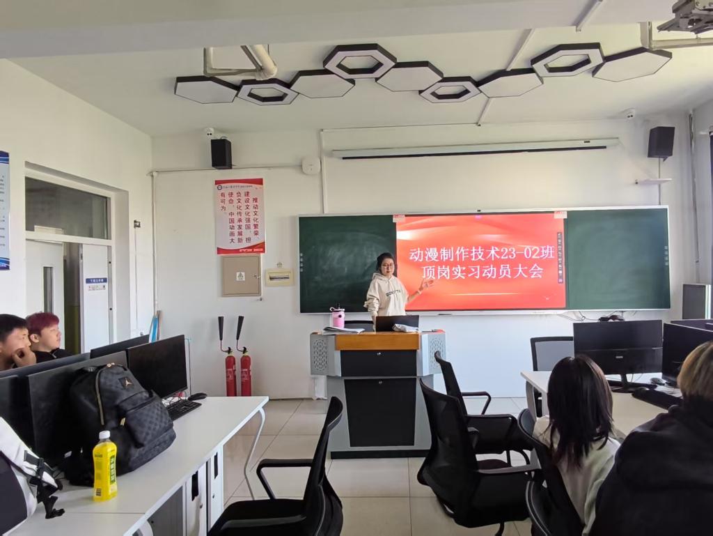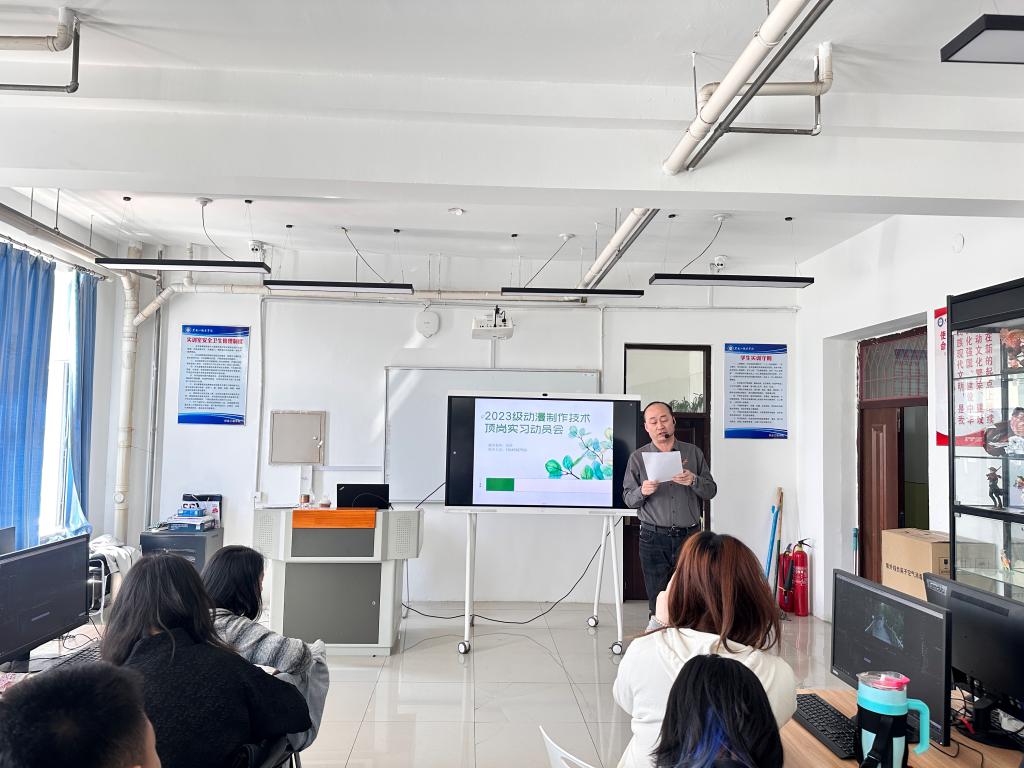 大会伊始,动漫制作专业主任郭帅发表了开幕致辞。郭帅主任强调了顶岗实习作为动漫制作专业教学体系中关键环节的重要性,它不仅是对学生们过去数年专业学习成果的实战检验,更是帮助他们将理论知识转化为实际操作技能,实现从校园到职场无缝对接的桥梁。通过实习,学生们将深入了解动漫行业的工作流程、行业标准以及市场需求,为未来的职业发展奠定坚实基础。