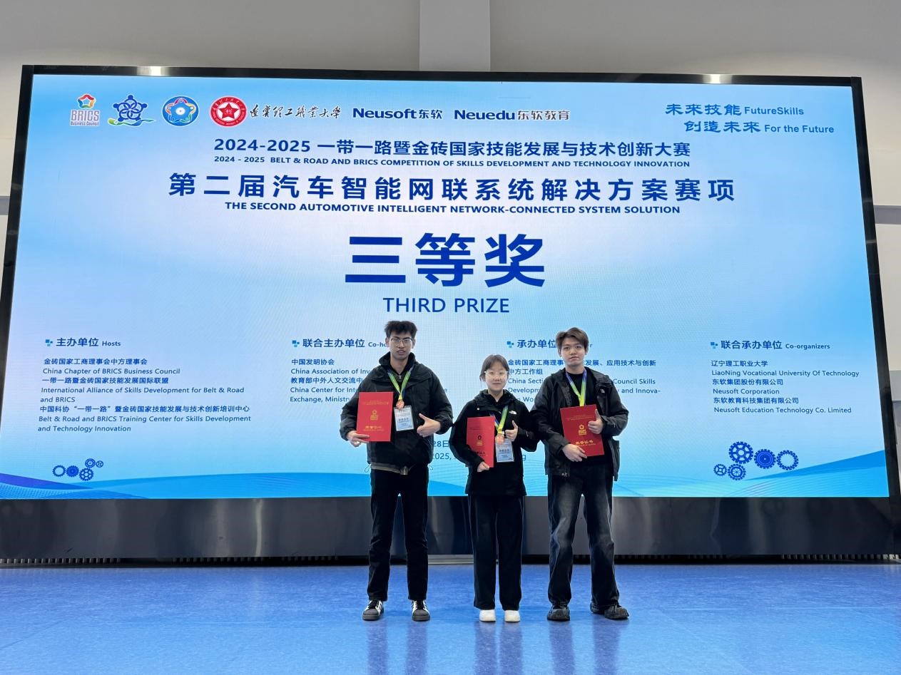2025年3月28日-29日,2024一带一路暨金砖国家技能发展与技术创新大赛之汽车智能网联系统解决方案赛项国内赛决赛在辽宁理工职业大学隆重举行,来自全国的55支参赛队伍同台竞技,KY开元官网信息工程学院邱志旺、宋志鹏、杨雪以及陈明泽、曹耘赫、丁莹六名学生组成的两个团队,凭借着娴熟的专业技能、良好的心理素质,分别获得三等奖,为学校争得了荣誉。