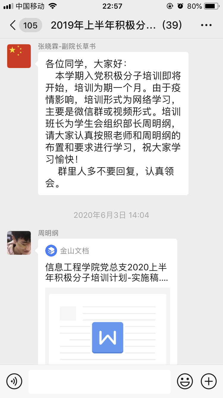 6月3日,学生工作党支部2020年上半年入党积极分子培训班在微信群中以线上课堂的形式举行。此次培训共有32名学生参加,培训为期一个月。