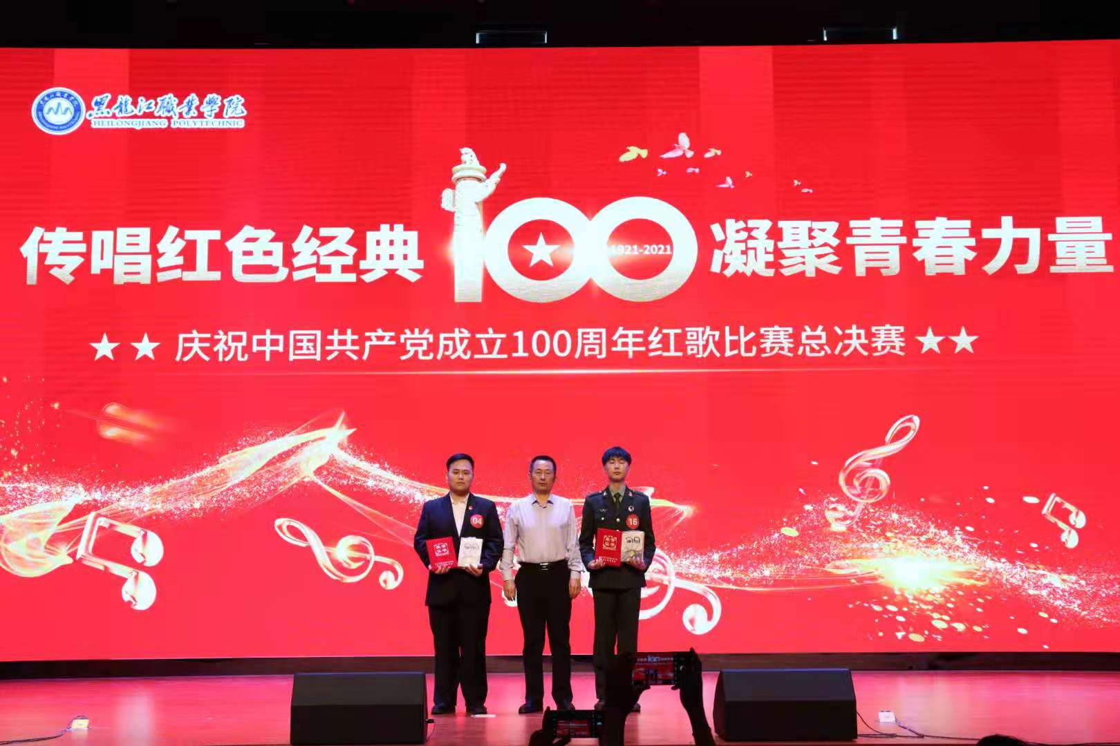 9个学院共有18支参赛队伍入围校级总决赛。参赛选手以饱满的热情、嘹亮的歌声、朝气蓬勃的精神面貌给评委团老师和观众留下了深刻印象。经过激烈角逐,最终信息工程学院数据技术20-02班韩洪涛演唱《永远的召唤》、物网技术19-01班于顺行演唱《不忘初心》荣获本次大赛一等奖,由校领导为其颁发了荣誉奖牌和奖品。